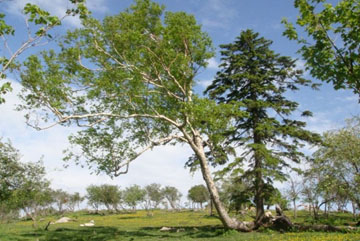 在長白山西坡一千六百米地帶,處處可見松樹和樺樹相依相偎生長在一起的動(dòng)人情景:松樹高大挺拔,莊嚴(yán)肅穆,象一位陽剛偉岸的男子;樺樹枝葉舒展,體態(tài)婀娜,似一個(gè)柔媚俏麗的佳人。這種奇觀位于長白山的高山花園地帶下方,是針葉林和闊葉林的混合交界區(qū)域,分屬于兩個(gè)植被帶上的代表性植物松樹和樺樹,在這里就像兩位感情篤深的戀人一樣,根連根,枝攀枝,共生共長。他們既像一對(duì)對(duì)情侶,在如毯般鋪就的松軟草地上約會(huì),又像在一起舉行盛大的集體婚禮,這就是陣容強(qiáng)大的“松樺之戀”景觀。實(shí)際上,這是因長白山頂部區(qū)域因海拔高,空曠風(fēng)大,土層淺薄且含水量大,單獨(dú)的松樹或樺樹在這里都不易生存,極易被山風(fēng)刮倒,而兩樹相伴共生,以松樹的根莖能深深扎入巖石的縫隙中,不被狂風(fēng)拔起,而岳樺的根須能廣泛地分布表層土壤中,起到穩(wěn)固的作用,這是植物與嚴(yán)酷的環(huán)境抗?fàn)幍漠a(chǎn)物,也是自然界長期選擇和淘汰的結(jié)果。在不同的季節(jié)里,“松樺戀”呈現(xiàn)出不同的景象。他們相互簇?fù)?、剛?cè)嵯酀?jì)、生死在一起的決絕,自然引發(fā)人們給予他們美好情愛的敬仰和謳歌。人們常常躑躅他們面前生出無限感慨:看到松樺之戀,誰說草木無情!