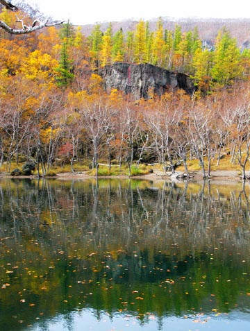 水體幽深、水面舒展,融蝕著周圍岳樺樹的蔭綠,形成了一塊溫潤的和田碧玉,幽綠泛藍,鑲嵌在寂靜的山巒中;水中生有金鱒、紅鱒等冷水魚類,穿梭游動。潭面薄霧輕浮,人行棧道時隱時現(xiàn),如臨瑤池仙境。